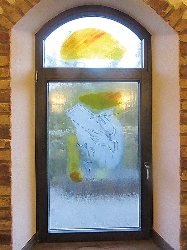 Bei den Darstellungen des Hl. Luks und des Hl. Benedikts hat die Künstlerin keine figürlichen Darstellungen verwendet, sondern in jedes Fenster Hände mit den Attributen, die man dieser Person zuordnet, gemalt.