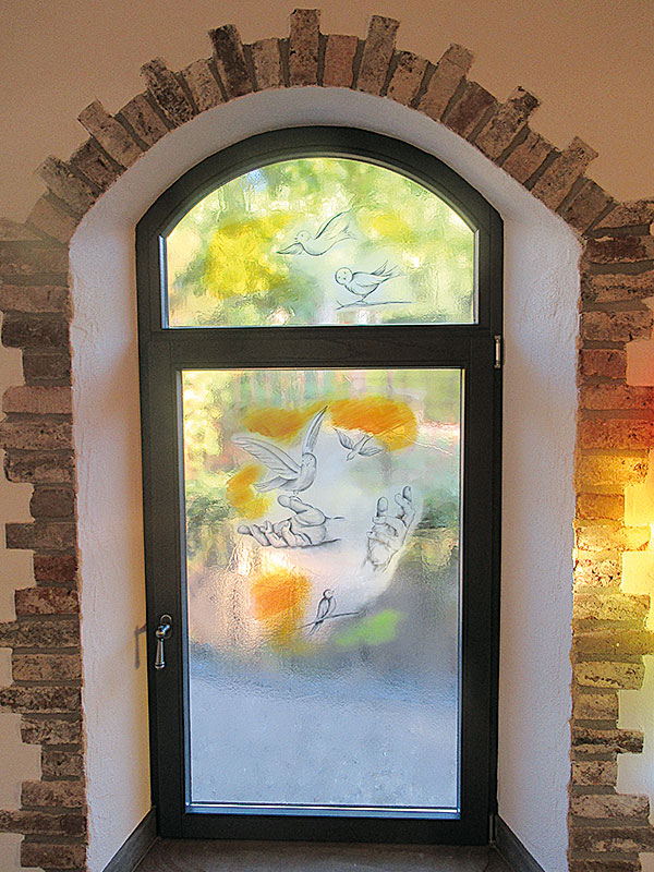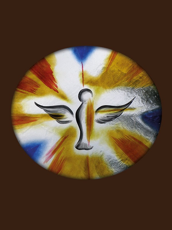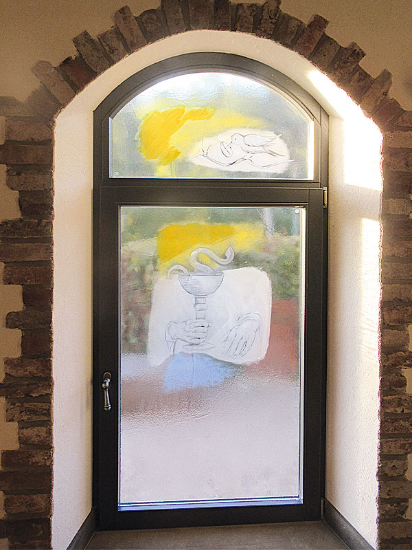 Die vier Stichbogenfenster zeigen Attribute von bekannten Heiligen und sollten in drei Darstellungen bewusst die Namenspatrone unserer Kinder zeigen. (Rita Patricia, Benedikt und Lukas)