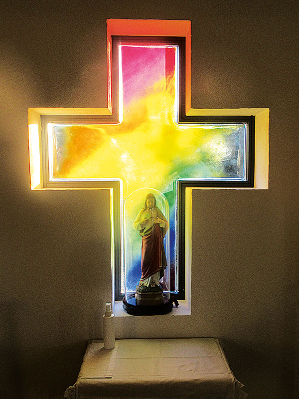 Die Fenster der Kapelle wurden von der Glaskünstlerin Helga Feuser-Strasdas gemalt und gebrannt. Die Fensterrahmen wurden aus deutscher Eiche angefertigt. Die äußere Scheibe ist aus Sicherheitsglas (ESG).